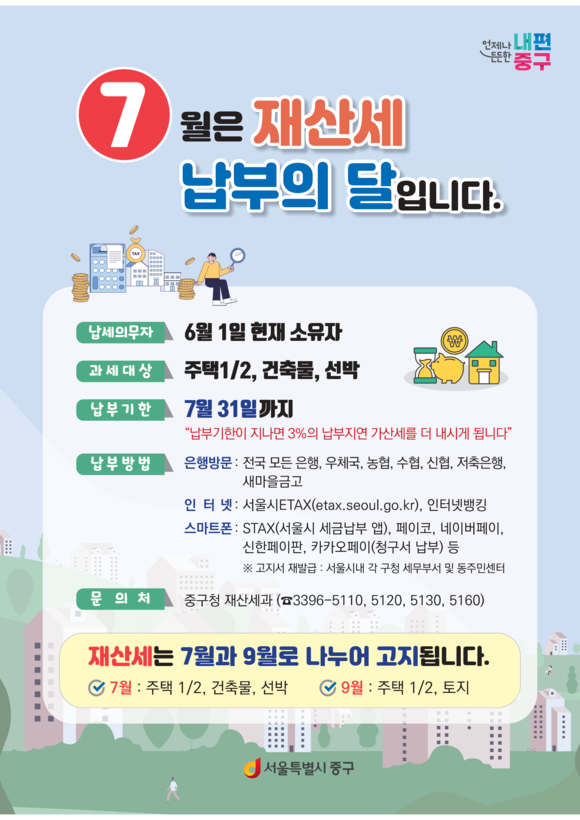 서울 중구가 7월 정기분 재산세로 671억원을 부과했다. 지난해 보다 25억원 증가한 규모다. 납부 기한은 7월 31일까지로 최종 납기를 넘기면 3%의 납부지연 가산세가 부과되므로 주의해야 한다.