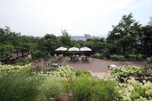 ▲ 개운산의 명소로 자리 잡은‘여름향기정원’은 2024년 11월에 개방했다. 이에 앞서 마로니에 마당 인근 무단 점유 시설에 대한 자진철거 명령 및 행정대집행 영장 발부 등의 관련 절차를 진행했다. 이 공간에 교목 및 관목 7종 316주, 수국 등 초화류 25종 4,341본을 심어 사계절 매력을 발산하는 ‘여름향기정원’을 조성했다. 정원 주변에는 쉼터와 그늘막, 테이블 등의 편의시설을 조성해 아이부터 어른까지 모든 세대가 정원을 느끼며 사계절 소풍을 즐길 수 있도록 했다. 사계절 내내 아름다운 풍경을 자랑해 ‘인생샷 명소’로 자리를 잡았다.