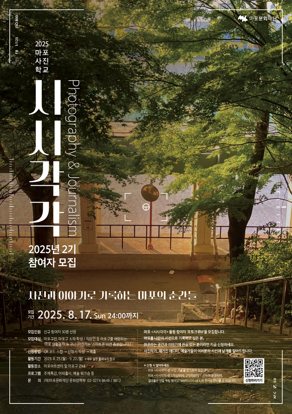 서울 마포문화재단(대표이사 고영근)은 오는 8월 17일까지 2025 마포 사진학교 <시시각각> 활동에 참여할 ‘포토크루M’을 모집한다. 마포 사진학교 <시시각각>은 ‘시시때때로(時時) 깨닫고(覺) 새긴다(刻)’라는 뜻을 지닌 사진 활동 프로젝트로, 마포에서 활동하는 개인의 시선을 모으고 기록하는 과정을 통해 지역의 이슈와 이야기를 발견하는 사업이다.