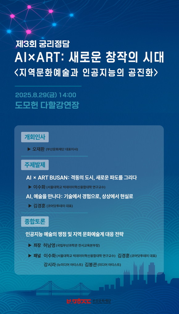 부산문화재단 오재환 대표이사는 “「궁리정담」은 변화하는 문화예술 환경 속에서 지역이 주체적으로 대응하고 상상할 수 있는 자리를 마련하는 데 의미가 있다”며,“특히 이번 행사가 예술과 기술을 함께 바라보고, AI 시대 문화정책의 미래를 다각적으로 그려보는 기회가 되기를 바란다”고 전했다.