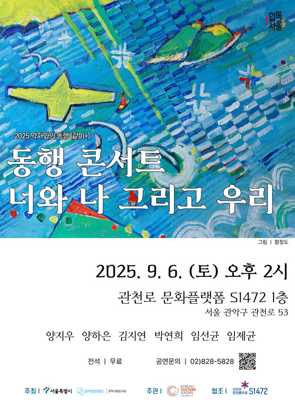 서울 관악문화재단(대표이사 소홍삼)이 9월 6일(토) 오후 2시, 관천로 문화플랫폼 S1472에서 ‘2025 약자와의 동행 <같이+> – 동행 콘서트 : 너와 나, 그리고 우리'’를 개최한다.