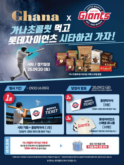 롯데웰푸드가 초콜릿 브랜드 ‘가나’가 롯데자이언츠와 함께 야구팬을 위한 이벤트를 진행한다고 27일 밝혔다.