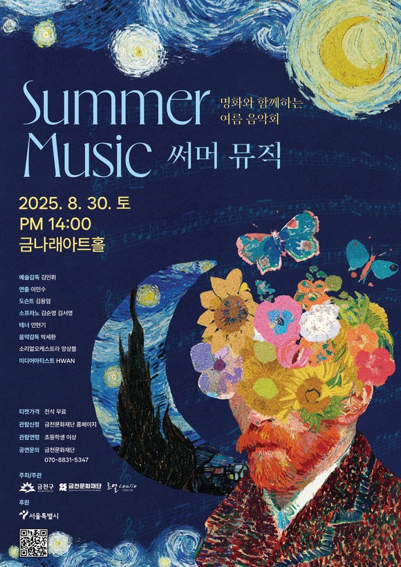 서영철 금천문화재단 대표이사는 “이번 공연은 무더운 여름날 구민에게 시원한 문화적 휴식을 선사하고자 마련했다”라며 “금나래아트홀 무대를 가득 채우는 명화 미디어아트를 통해 마치 작품 속에 직접 들어간 듯한 환상적인 공연을 경험하시길 바란다”라고 전했다.