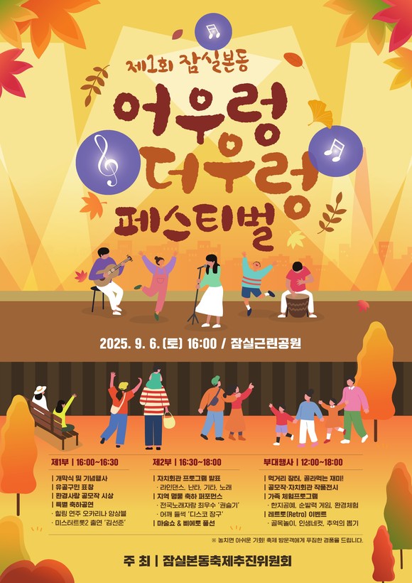 서울 송파구(구청장 서강석) 잠실본동 축제추진위원회는 주민이 함께 기획하고 참여하는 첫 마을 축제인「제1회 잠실본동 어우렁더우렁 축제」를 오는 2025년 9월 6일(토요일) 오후 4시, 잠실근린공원에서 개최한다.