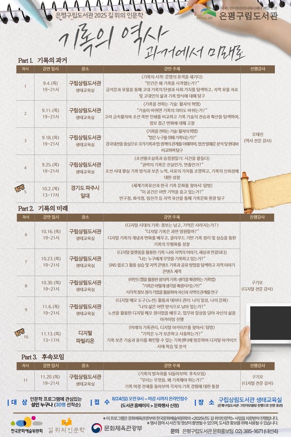 강연 종료 후에는 참여자 중심의 ‘기록인문 동아리’ 후속 모임을 연계 운영해 지속적인 기록 활동과 인문학적 교류가 확산할 수 있도록 지원할 계획이다.