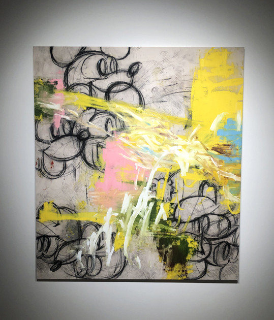 2024년 작품 ‘테페스트(Tepest)’ 또한 작가 특유의 즉흥적 제스처와 강렬한 색채 실험이 잘 드러난 대표작이다. 노란색 바탕이 화면 전체에 강한 에너지를 부여하며, 그 위에 얹힌 굵고 거친 붓질과 중첩된 드로잉은 캐릭터의 형태를 부분적으로 드러내면서 동시에 흐트러뜨린다.