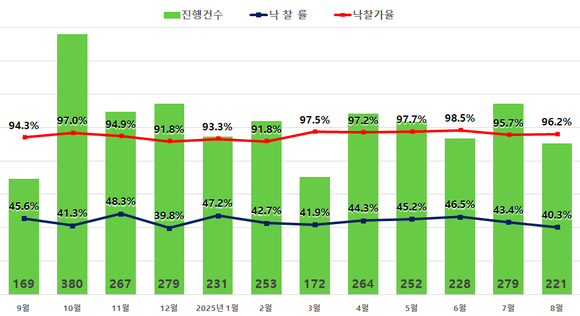한편, 8월 전국 최고 낙찰가는 서울 성동구 성수동의 한 공장으로, 감정가(2,201억 원)의 100.02%인 2,202억 원에 매각되며 역대 최고 낙찰가를 기록했다. 최다 응찰자는 성남시 분당구 이매동 아파트(전용 135㎡)로, 60명이 몰려 감정가의 120.6%인 15억 2천만원에 낙찰됐다.