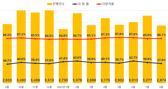 경·공매 데이터 전문기업 지지옥션이 4일 발표한 ‘2025년 8월 경매동향보고서’에 따르면, 전국 아파트 경매 진행건수는 2,874건으로 전월 대비 약 12% 줄었고, 낙찰률은 37.9%로 2.0%포인트 하락했다.
