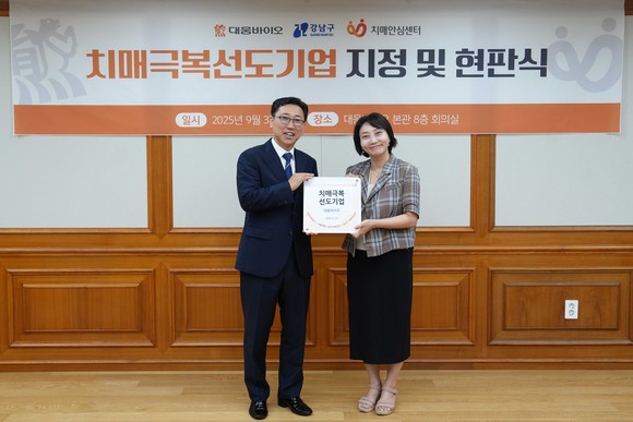 대웅바이오(대표 진성곤)가 3일 서울특별시로부터 ‘치매극복선도기업’으로 지정돼 기념 현판을 수여받았다.