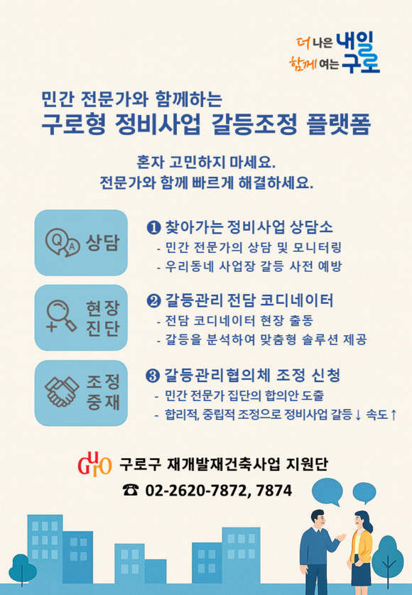 서울 구로구(구청장 장인홍)가 정비사업 추진 과정에서 반복되는 갈등과 분쟁을 예방하고 안정적인 사업 진행을 지원하기 위해 ‘민간 중심 구로형 정비사업 갈등조정 플랫폼’을 본격 운영한다.