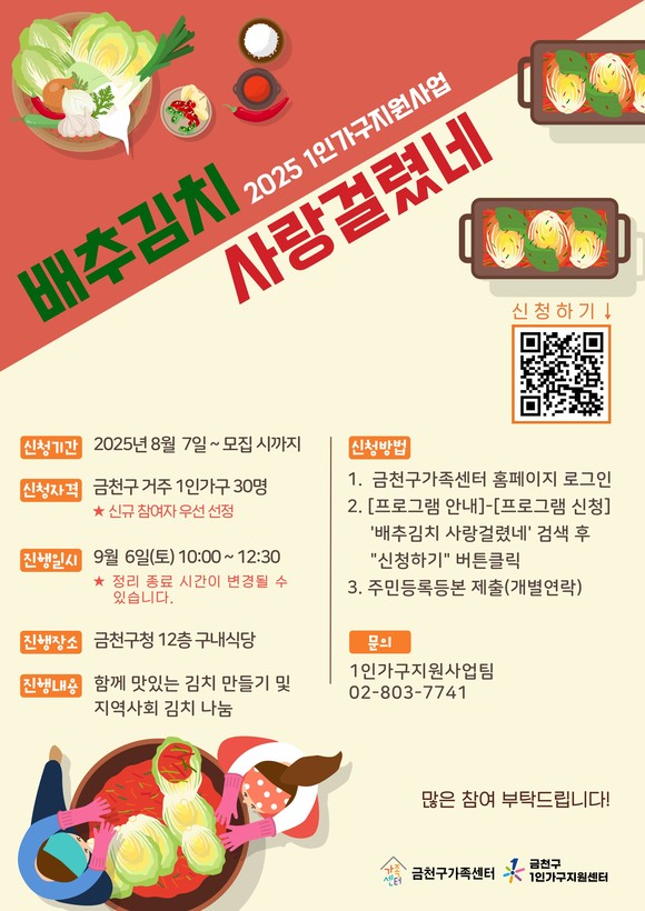 서울 금천구(구청장 유성훈)는 9월 6일 오전 10시 금천구청 구내식당에서 1인가구 김장 행사 ‘배추김치 사랑걸렸네’ 를 개최한다고 밝혔다.