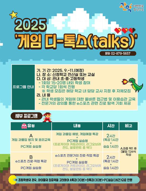 서울 관악구(구청장 박준희)는 청소년들이 게임을 건강하게 활용할 수 있도록 돕기 위해 오는 9월부터 ‘2025 「게임 디-톡스(Talks)」’ 프로그램을 운영한다.