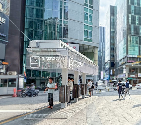 또 '개방형 제연 흡연시설'은 규제와 단속 위주의 기존 방식에서 나아가 흡연 혐오의 근본원인인 ‘연기와 냄새’ 문제를 해결하기 위해 기술과 디자인을 융합한 것이 특징이다. 흡연자 밀집 지역에 설치된 이 흡연시설은 에어커튼을 적용해 담배연기의 외부 확산을 차단하고, 특허 공법의 제연 정화장치 4대를 탑재해 정화한 공기를 배출한다. 여기에 자동 소화 기능의 대용량 재떨이를 설치해 흡연자의 편의와 환경 개선을 동시에 충족시켰다.