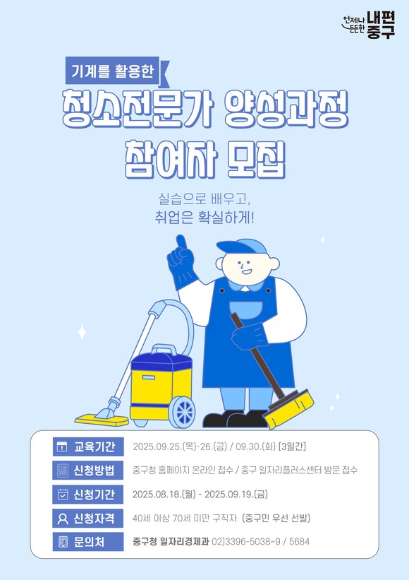 서울 중구가 오는 9월 25일부터 30일까지 구직 선호도가 높은 청소 분야 전문 인력을 키우기 위해 <기계를 활용한 청소전문가 양성과정>을 운영한다.