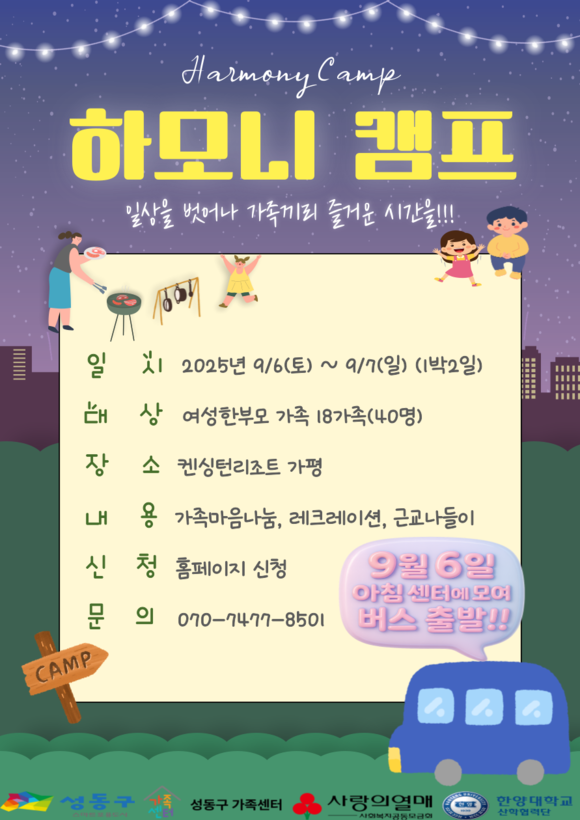 서울 성동구(구청장 정원오)는 여성한부모 가족의 정서적 안정과 가족 유대 강화를 위해 오는 9월 6일부터 7일까지 1박 2일 일정으로 '하모니 캠프'를 개최한다고 밝혔다.