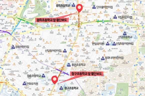 서울 중구가 교통약자와 주민들의 안전하고 편리한 보행환경을 조성하기 위해 청구초등학교와 광희초등학교 앞 횡단보도 2개소에 ‘보행신호 자동연장 시스템’을 설치했다.