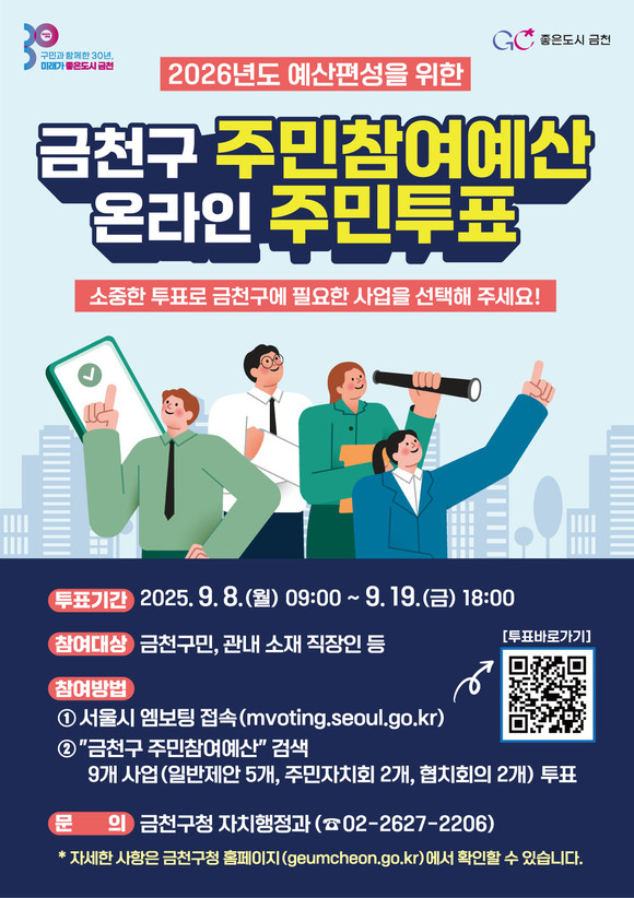 서울 금천구(구청장 유성훈)는 9월 8일부터 9월 19일까지 ‘2026년도 금천구 주민참여예산사업’ 선정을 위한 온라인 주민투표를 실시한다고 밝혔다.