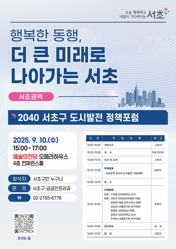 서울 서초구(구청장 전성수)는 ‘2040 서초구 도시발전 기본계획’의 비전과 추진전략을 공유하고 주민 의견을 수렴하기 위해 오는 10일(수) 15시 예술의전당 오페라하우스에서 「서초권역 2040 서초구 도시발전 정책포럼」을 개최한다고 밝혔다. 이어서 오는 23일 14시 방배열린문화센터에서 방배권역 정책포럼을 열어 권역별로 서초의 미래 발전상에 대한 청사진을 공유하게 될 전망이다.