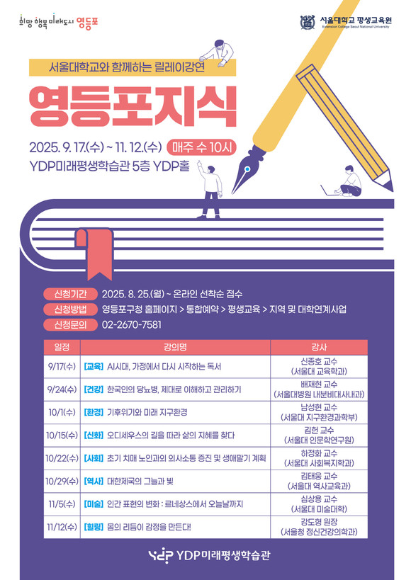 최호권 영등포구청장은 “서울대 교수진과 함께하는 명강의를 가까이서 들을 수 있는 소중한 기회가 될 것”이라며 “앞으로도 구민들이 지속적으로 배우고 성장할 수 있도록 다양한 학습 기회를 확대해 나가겠다”라고 전했다.