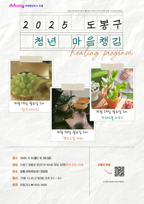 오언석 도봉구청장은 “청년들이 이번 프로그램을 통해 마음을 돌보고 일상에서 잠시 숨을 고를 수 있는 시간이 되길 바란다.”라고 말했다.
