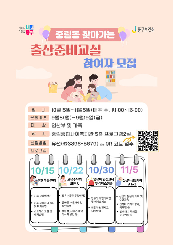 서울 중구가 10월 15일부터 11월 5일까지 매주 수요일 오후 2시 중림동에서 <찾아가는 출산준비교실>을 운영한다.