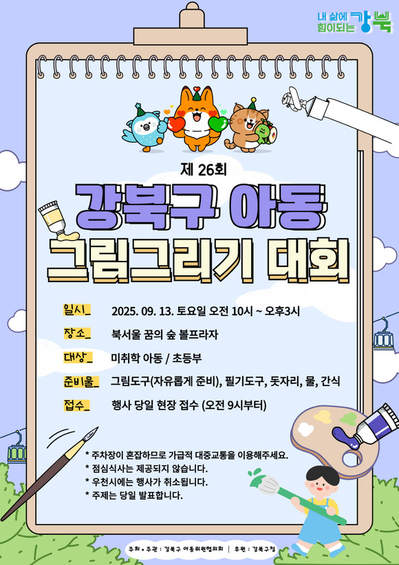 참가 자격은 강북구에 주소지를 둔 미취학 아동과 초등학생으로, 신청은 당일 오전 9시부터 현장 접수를 통해 가능하다. 도화지는 주최 측에서 제공하며, 그림 도구와 필기도구, 돗자리, 간단한 간식 등은 참가자가 직접 준비해야 한다.