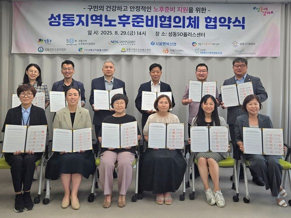 한편 성동구는 중장년 세대의 체계적인 노후준비 지원을 위해 ‘성동지역노후준비협의체'를 새롭게 구성했다. 지난 8월 29일에 진행된 협약식에는 성동구, 성동지역노후지원준비센터(성동50플러스센터)를 비롯해 ▲국민연금공단북부지역본부 ▲성동여성인력개발센터 ▲서울행복신협 ▲성동구마을자치지원센터 ▲성동구가족센터 ▲성동구파크골프협회 ▲성동구자원봉사센터 ▲건강한의료복지사회적협동조합 ▲성동구정신건강복지센터 ▲성동구치매안심센터 등 10개 기관이 참여해 상호 협력의 기반을 다졌다.