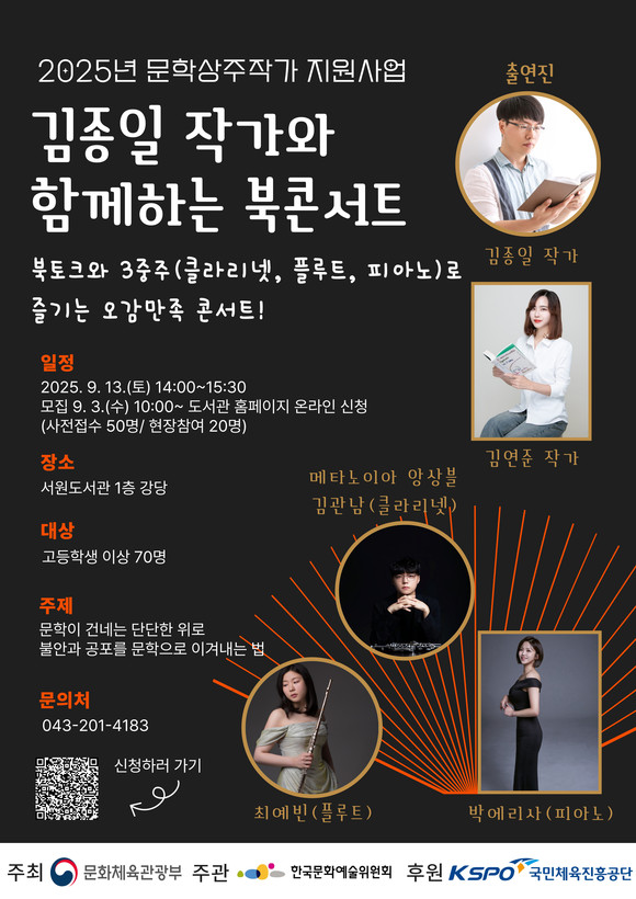 ‘청주서원도서관’에서는 상주작가 김종일 소설가와 함께 ‘문학이 건네는 단단한 위로’를 주제로 북토크와 클래식 앙상블 공연을 선보일 예정이며, 제천‘산책도서관’에서는 「PLAY LAB: 산책도서관 희곡 연구실」을 통해 변사극과 희곡의 관계를 탐구하며 문학분야의 시야를 확장하는 새로운 시도를 보여줄 예정이다.