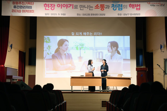 서울 강남구(구청장 조성명)가 9일 대치2동 문화센터 대강당에서 청렴추진기획단·중간관리자 400여 명을 대상으로 연극형 청렴강연 청렴·소통 리더십 아카데미를 성황리에 개최했다.