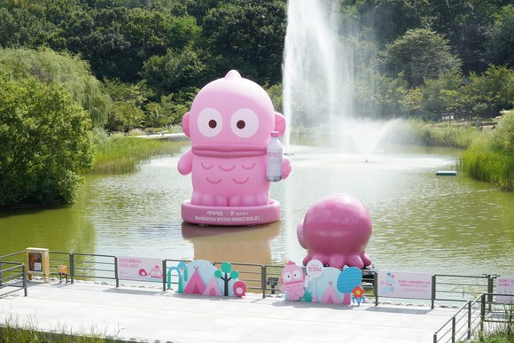 롯데칠성음료는 내달 12일까지 산리오의 인기 캐릭터 ‘한교동’, ‘사유리’와 협업해 월영지 안에 대형 조형물을 설치하고, 수질 정화 로봇을 활용한 친환경 캠페인을 진행한다.