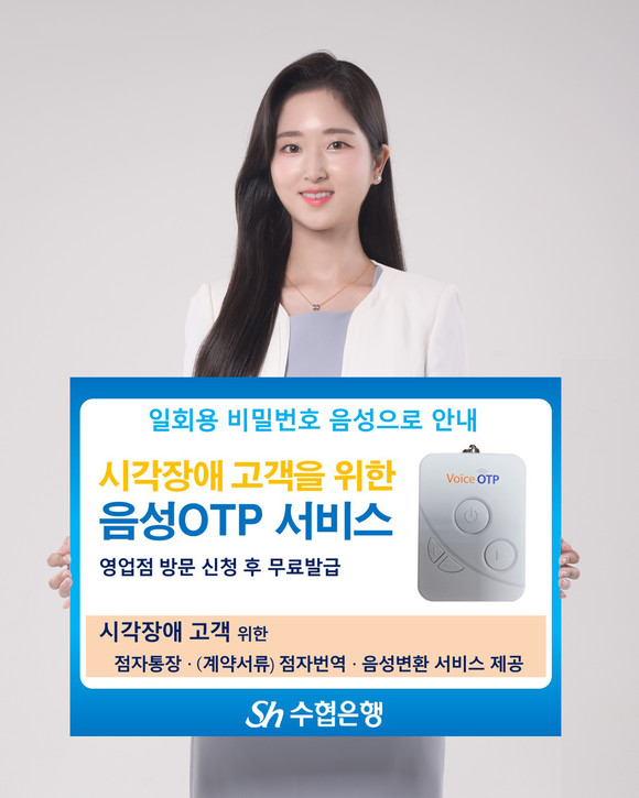 음성OTP는 실물 OTP에 연결한 이어폰을 통해 일회용 비밀번호를 음성으로 안내하는 서비스로, 숫자 식별이 어려운 시각장애 고객도 보다 쉽고 편리하게 금융거래를 이용할 수 있도록 돕는다. 이용을 원하는 시각장애 고객은 전국 Sh수협은행 영업점을 방문해 신청하면 무료로 발급받을 수 있으며, 영업점 거래뿐 아니라 텔레뱅킹, 인터넷뱅킹, 모바일뱅킹(파트너뱅크 앱)에서도 인증수단으로 활용할 수 있다.