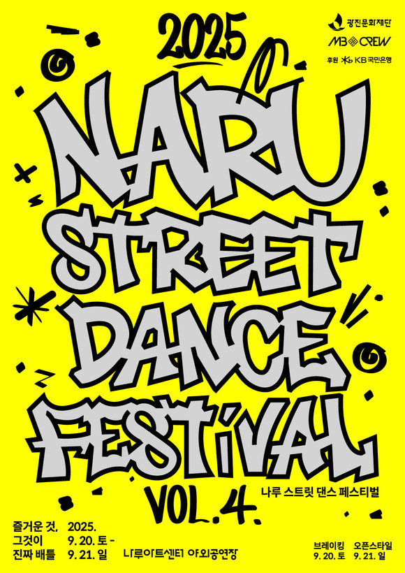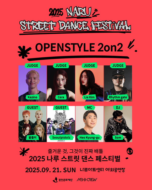 총 우승 상금 1천 5백만원(1,500만원)을 두고 펼치는 <2025 나루 스트릿 댄스 페스티벌>은 9월 20일(토) 브레이킹, 21일(일) 오픈 스타일 장르 2대2 배틀로 각각 진행되며, 전 세계를 무대로 활동 중인 대한민국 대표 댄서들이 심사위원 및 게스트로 참여한다.