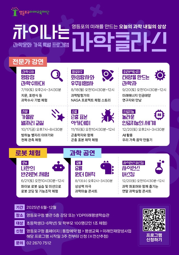 영등포구 미래교육재단 관계자는 “자녀 진로 설계에 필요한 전문 지식을 얻고 생활 속에서 과학을 즐기는 기회가 될 것”이라며 “앞으로도 시대 흐름에 맞는 다양한 프로그램을 통해 구민 모두가 함께 성장할 수 있도록 지원하겠다”라고 전했다.