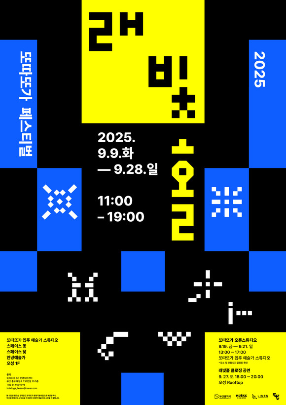 부산문화재단(오재환 대표이사)이 주최하고, ㈜리멘(성현무 대표)에서 주관・위탁 운영하는 원도심 창작공간 또따또가가 올해의 대표 프로그램인 「2025 또따또가 페스티벌 〈래빛홀〉」을 오는 9월 9일(화)부터 9월 28일(일)까지 개최한다. 이번 페스티벌은 입주 예술가들의 창작 성과를 시민과 공유하는 축제로, 전시·공연·참여·비평 등 다채로운 프로그램과 함께 오픈스튜디오가 열리며 원도심 일대를 예술의 장으로 확장한다.