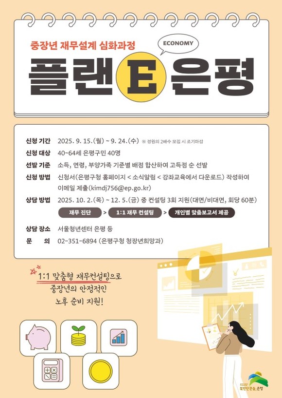 서울 은평구(구청장 김미경)는 중장년의 안정적인 노후 준비 지원을 위해 1:1 맞춤형 재무컨설팅 ‘플랜 E 은평’을 운영하고 신청자를 모집한다고 밝혔다.