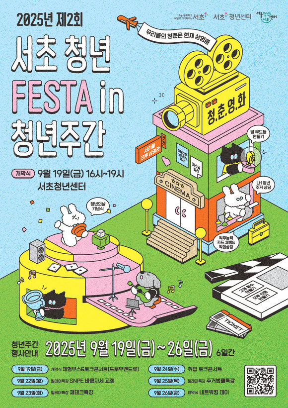 19일에 열리는 개막행사는 ‘청.춘.영.화(우리의 청춘은 현재 상영 중)’라는 주제로 진행된다. 유상욱 마술사의 해리포터 콘셉트 공연을 시작으로 모범 청년을 격려하는 ‘서초청년상’ 시상식이 열리고, 70만 구독자를 보유한 유튜버 드로우앤드류가 ‘나의 N잡 성공기: 좋아하는 일로 경제적·시간적 자유를 얻는 법’을 주제로 청춘들의 고민 상담 토크콘서트를 진행한다. 이날 센터 곳곳은 영화 콘셉트 체험부스로 꾸며져 ‘악마는 프라다를 입는다’ 부스에서는 퍼스널 컬러 진단 체험을, ‘라라랜드’ 부스에서는 달 무드등 만들기 체험 등을 즐길 수 있다.