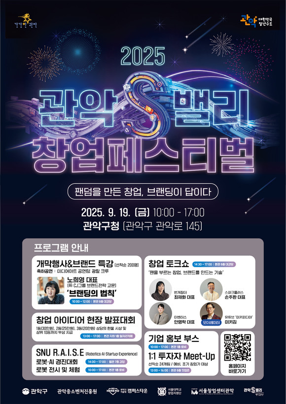 서울 관악구(구청장 박준희)가 오는 19일 ‘2025 관악S밸리 창업페스티벌’을 개최, 벤처기업과 투자자, 청년이 함께하는 아이디어와 기술 교류의 장을 연다.