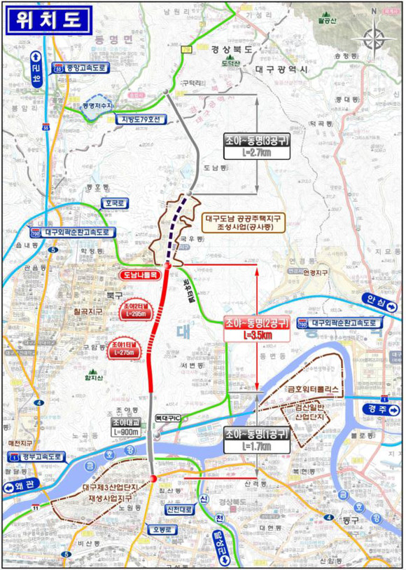 대구의 숙원사업인 조야~동명 광역도로 건설공사는 총연장 7.9㎞, 폭 20m, 왕복 4차로 규모로 건설된다. 공사 구간은 △1공구(1.7㎞·침산동~조야동) △2공구(3.5㎞·조야동~도남공공주택지구) △3공구(2.7㎞·도남공공주택지구~칠곡 동명면)로 나뉜다. 전체 구간에는 교차로 6곳과 터널 3곳이 설치되며, 본선 제한속도는 시속 80㎞, 연결도로는 40㎞로 계획됐다.