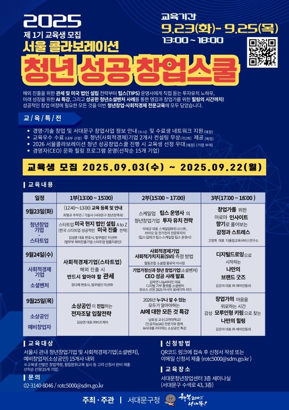 이성헌 서대문구청장은 “창업 현장에서 바로 도움이 될 수 있는 실질적이고 체계적인 콘텐츠로 청년 성공 창업스쿨을 준비했다”며 “청년 창업가와 사회적경제기업들을 위한 도약의 기회가 될 것으로 기대한다”고 말했다.