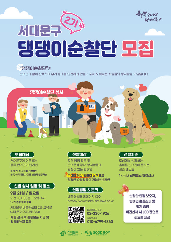 서울 서대문구(구청장 이성헌)가 이달 20일까지 ‘제2기 서대문 댕댕이 순찰단’ 단원을 모집한다. 관내 거주하고 맹견이 아닌 등록동물을 키우는 반려견주 누구나 신청할 수 있다.