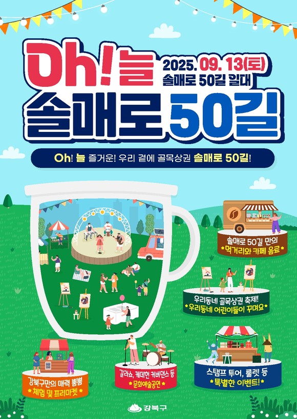 서울 강북구(구청장 이순희)는 오는 13일(토) 오전 11시부터 오후 6시까지 미아역 인근 솔매로50길 상권에서 ‘오(Oh)!늘, 솔매로50길 축제’를 개최한다고 밝혔다.