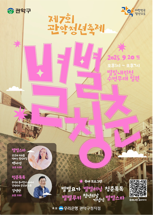 서울 관악구(구청장 박준희)가 오는 9월 20일(토) 오후 1시부터 7시까지 신림역 별빛내린천 일대에서 제7회 관악청년축제 「별별청춘」을 개최한다.