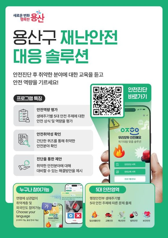 서울 용산구(구청장 박희영)가 올해 말까지 구민의 재난 대응 역량 강화를 위해 ‘재난안전 진단 모바일 교육’을 본격 추진한다. 사회·기후 환경의 다변화에 따른 재난 위험 증가에 효과적으로 대응하기 위해 마련했다.