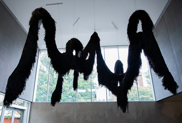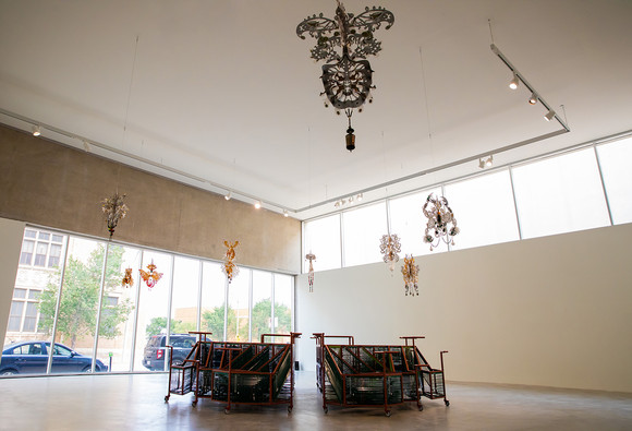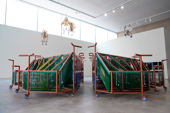 특히 이번 전시에서는 세인트루이스 현대미술관을 위해 제작된 대규모 커미션 신작 〈복수 둔덕 동차動車Mound Vehicles〉(2025)가 주목을 받고 있다. 미술관 전면창 안쪽 전시실에 설치되어 외부에서도 관람이 가능한 이 대규모 블라인드 설치작은 손잡이가 달린 네 개의 동차動車조각으로 이루어져 있다.