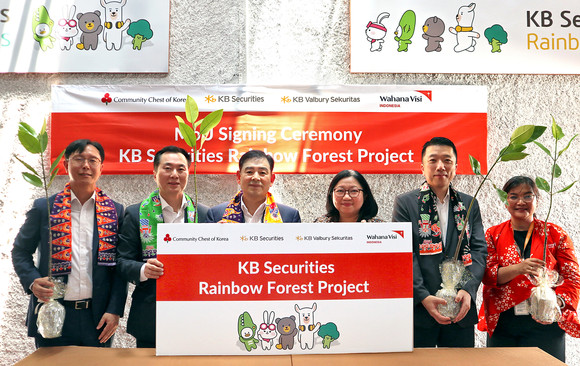 또한 KB증권은 지난해에 이어 두 번째로 인도네시아에서 '무지개숲' 협약을 맺고 카푹 무아라 지역에 20만 그루의 맹그로브 나무를 심기로 했다. 맹그로브 숲은 태풍·홍수 등 자연재해 예방과 생태계 보전, 나아가 기후변화 완화에도 중요한 역할을 한다.