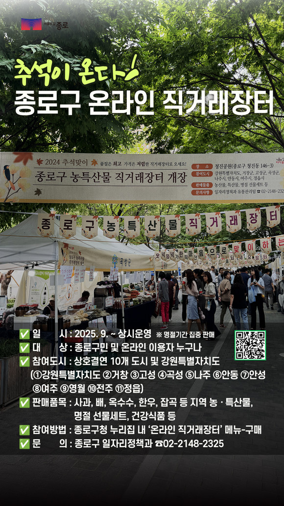 서울 종로구(구청장 정문헌)는 민족 최대 명절 추석을 맞아 구민들의 명절 준비 부담을 덜고, 지역 소상공인들의 매출 증대를 지원하기 위해 ‘종로사랑상품권’을 발행하고 온라인 직거래 장터를 운영한다.