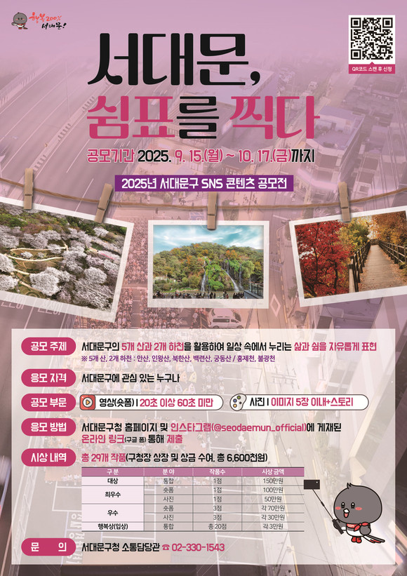 응모 기간은 이달 15일부터 다음 달 17일 오후 6시까지며 주제는 ‘서대문, 쉼표를 찍다 - 서대문 속 자연과 일상에서 발견한 쉼의 순간’이다.