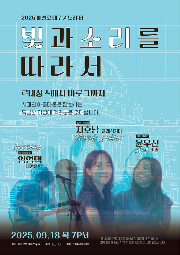 대구문화예술진흥원(이하 진흥원) 문화예술본부(본부장 방성택)는『2025 예술인파견지원사업–예술로 대구』의 일환으로, 오는 9월 18일 복합문화공간 노리:터에서 기획공연「빛과 소리를 따라서 – 르네상스에서 바로크까지」를 개최한다고 15일 밝혔다.