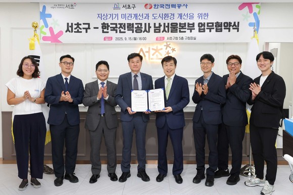 서울 서초구(구청장 전성수)가 15일 서초구청에서 한국전력 남서울본부(본부장 이재헌)와 ‘지상기기 미관 개선과 도시환경 개선을 위한 업무협약’을 체결했다고 밝혔다. 이번 협약은 두 기관이 상호 협력하여 서초구 공공보도상 지상기기 정비를 통해 도시환경을 개선하고 쾌적한 보행환경을 만들기 위해 추진됐다.
