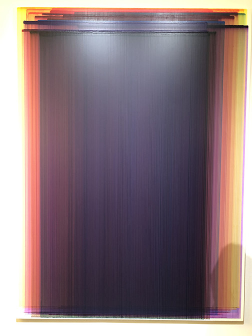 화면 중심엔 하나의 색이 주를 이루지만, 화면 옆면을 자세히 바라볼수록 겹치고 쌓인 수십 가지의 색의 흔적은 얼마만큼의 인고의 시간이 필요했을지 짐작케 한다. 작가는 납작한 평붓 여러 개를 이어 만든 대형 특수붓으로 선을 내리 그은 다음, 그 위에 다른 색을 만들어 또 올리는 과정을 반복한다. 색을 바꿀 때마다 붓도 빨아야 하고, 선을 하나 그으면 물감이 마를 때까지 기다려야 하는데, 이 과정이 수십 차례 반복되면 어찌 고행이 아닐 수 있을까.